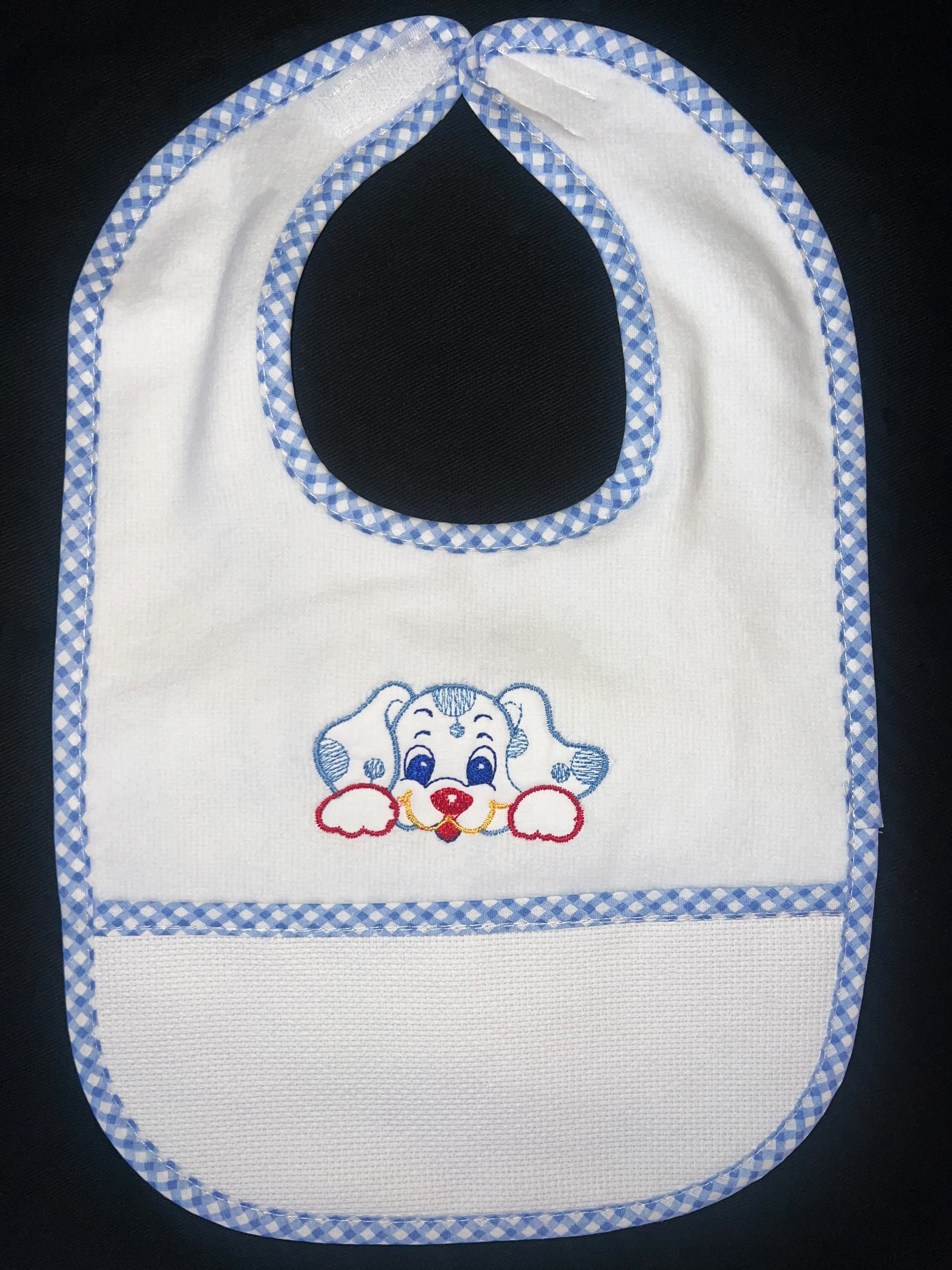 Ce modèle en tissu éponge blanc 100% coton FABRIQUÉ EN ITALIE est sublimé par un biais vichy et une broderie colorée représentant un petit chien. Idéal pour une naissance, un anniversaire ou simplement pour faire plaisir avec une touche personnalisée ✨